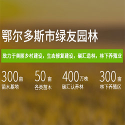 鄂爾多斯市綠友園林有限公司成立于2010年。公司現(xiàn)有苗木基地300畝,各類苗木50萬株,碳匯認(rèn)養(yǎng)林400畝,林下養(yǎng)殖區(qū)300畝,有各類特禽3萬多只,公司成立至今承攬生態(tài)修復(fù),綠化,碳匯造林,美麗鄉(xiāng)村建設(shè)等工程。公司以綠色和諧生態(tài)發(fā)展為理念,致力于美麗鄉(xiāng)村建設(shè),生態(tài)修復(fù)建設(shè),碳匯造林,林下養(yǎng)殖業(yè),本著快樂創(chuàng)業(yè),和諧發(fā)...