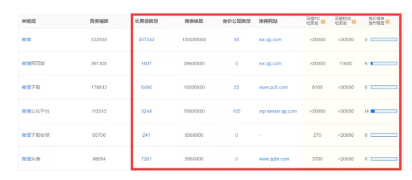 所有這些進(jìn)入長尾詞庫的關(guān)鍵詞,我們都會收集他們的各類指數(shù)、以及競價相關(guān)參數(shù),來輔助用戶了解這些詞確切的搜索量與熱度,以分析其商業(yè)價值。