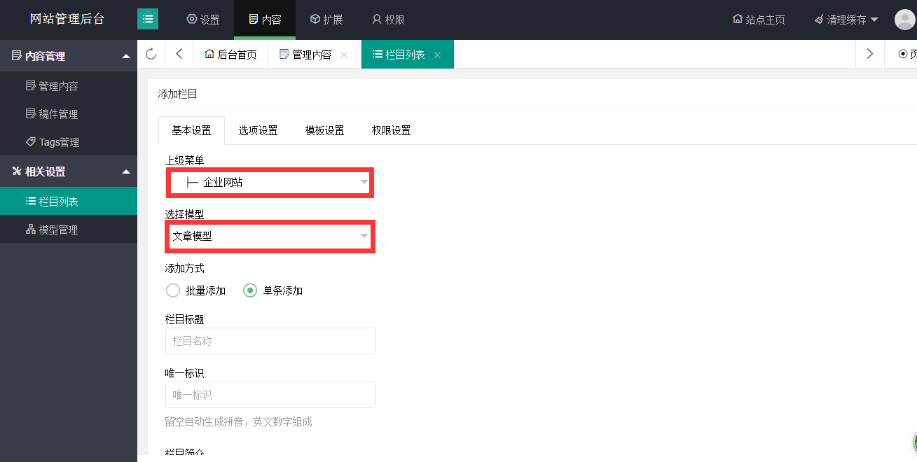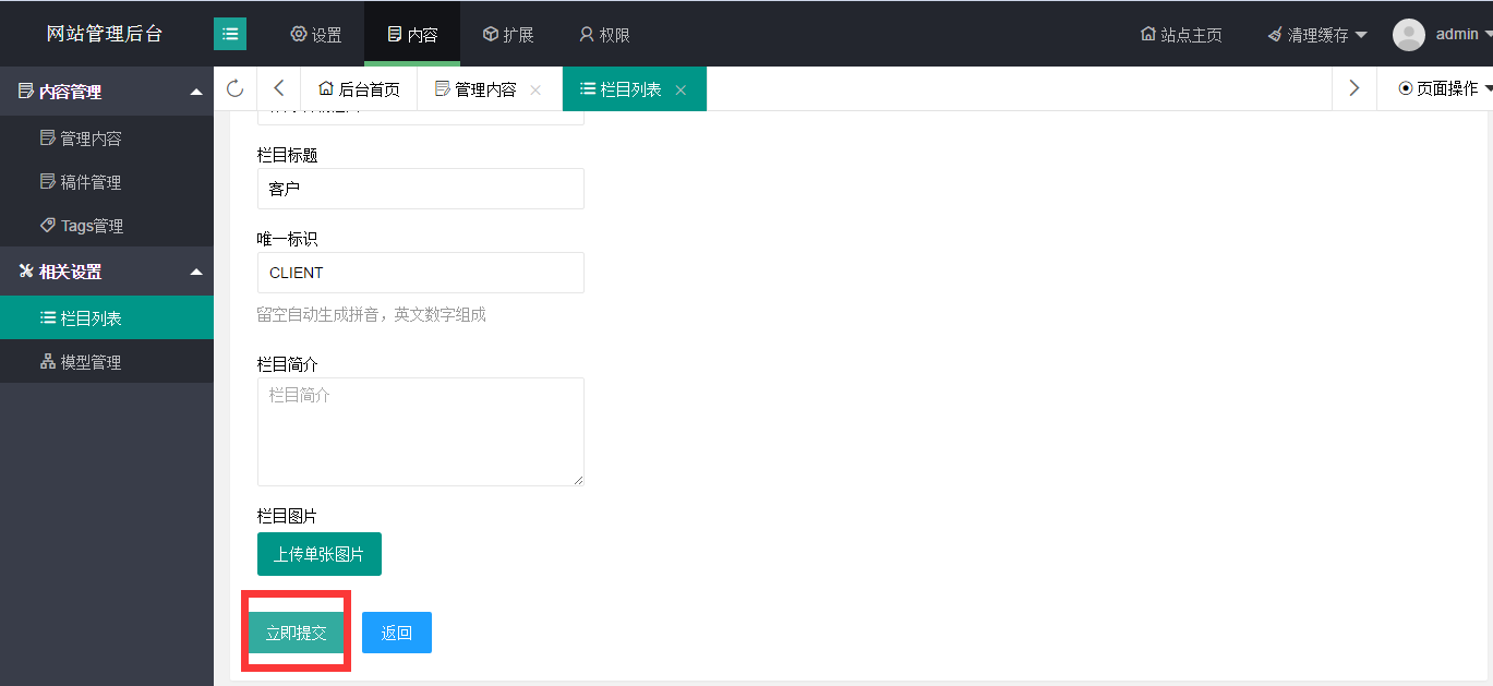 添加新的欄目時,點(diǎn)擊新增欄目,紅框中的內(nèi)容添加完整,然后點(diǎn)擊立即添加即可。