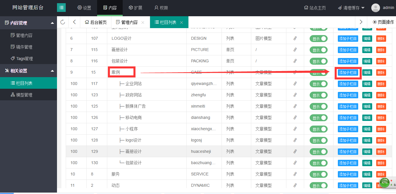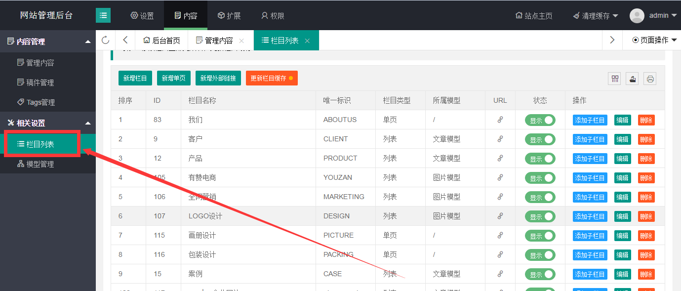 2.2欄目的添加,點(diǎn)擊左側(cè)的欄目列表