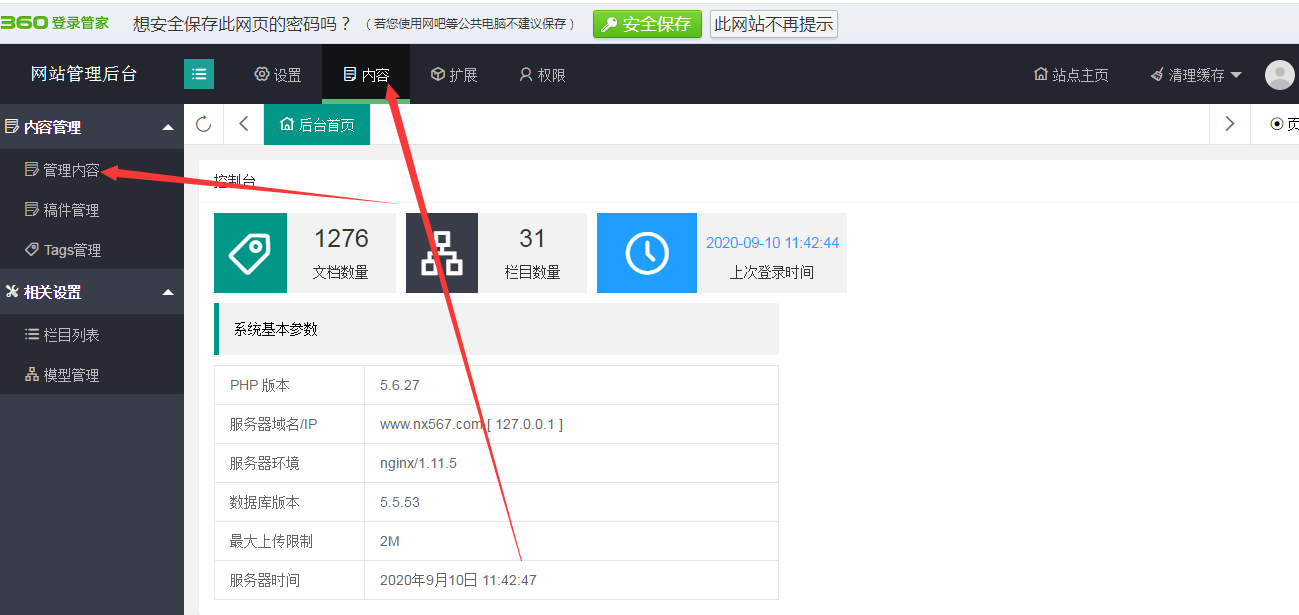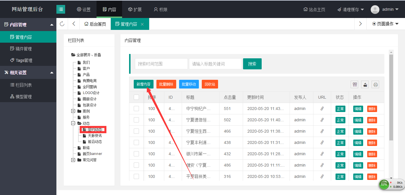 添加內(nèi)容時,點(diǎn)擊內(nèi)容,再點(diǎn)擊左側(cè)的管理內(nèi)容,就會出現(xiàn)相對應(yīng)的欄目