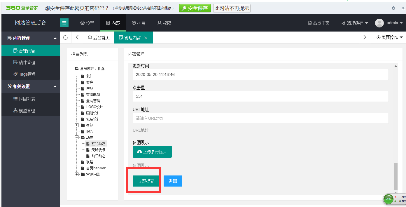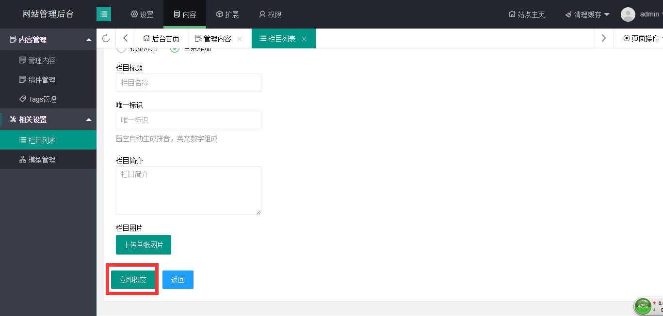 添加子欄目時,選擇相對應(yīng)的一級欄目,然后添加子欄目,將圖中紅框所指的內(nèi)容添加完整后,點(diǎn)擊立即提交即可。