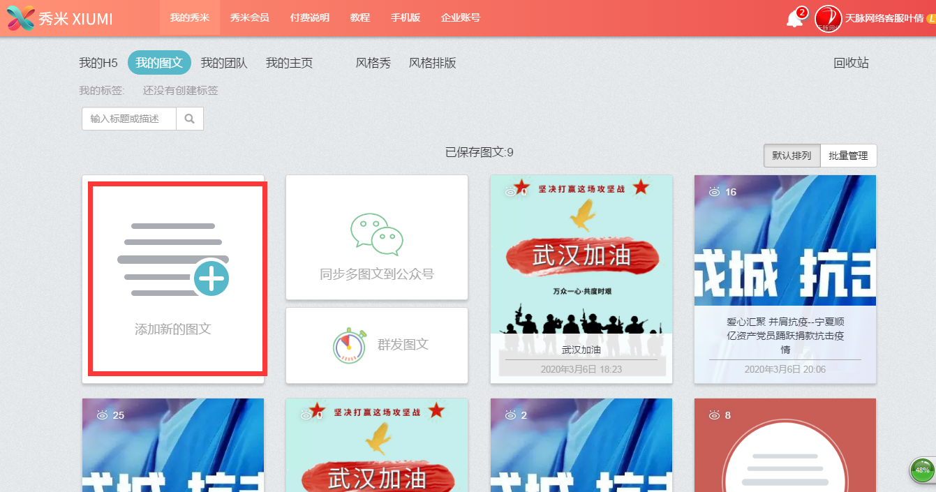 點(diǎn)擊我的秀米,選擇已保存的模板或者新建圖文