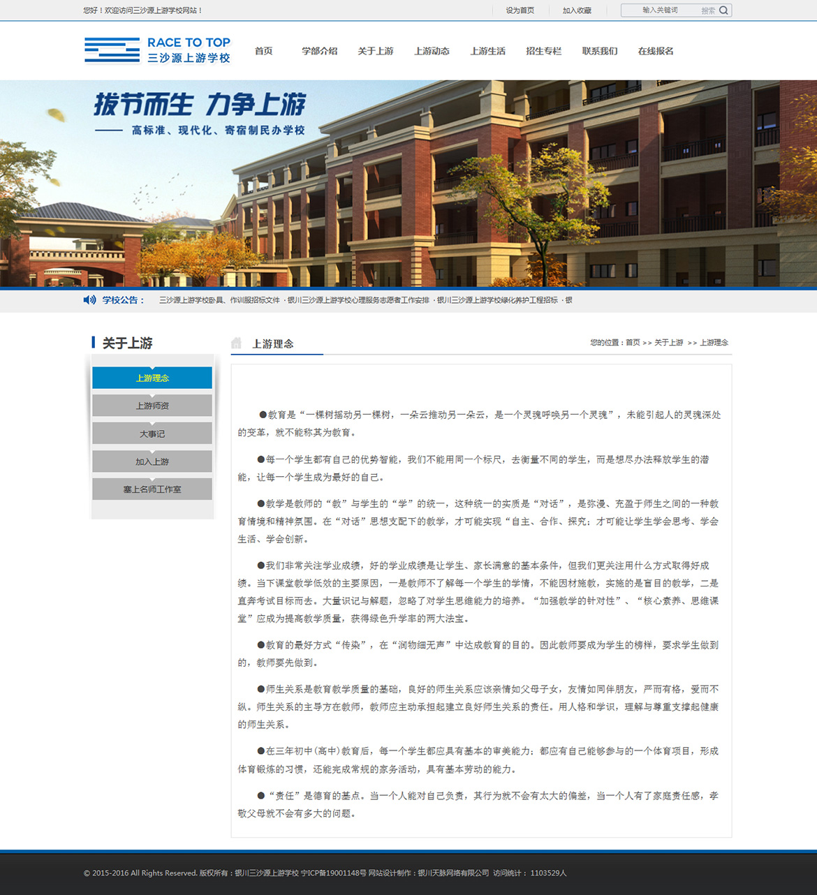 上游學(xué)校是由銀川置信投資發(fā)展有限公司與銀川一中原校長王力爭共同合作創(chuàng)辦的一所高標(biāo)準(zhǔn)、現(xiàn)代化、小班化(班額36人)、寄宿制民辦完全中學(xué)(初、高中)。辦學(xué)定位是:“寧夏最好 全國知名 素質(zhì)教育典范。”2016年首次招生,現(xiàn)有學(xué)生1500余名,教職工179人。