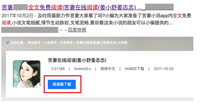 圖3-2 標(biāo)題標(biāo)明可下載小說,但頁面中誘導(dǎo)下載APP的負(fù)面案例
